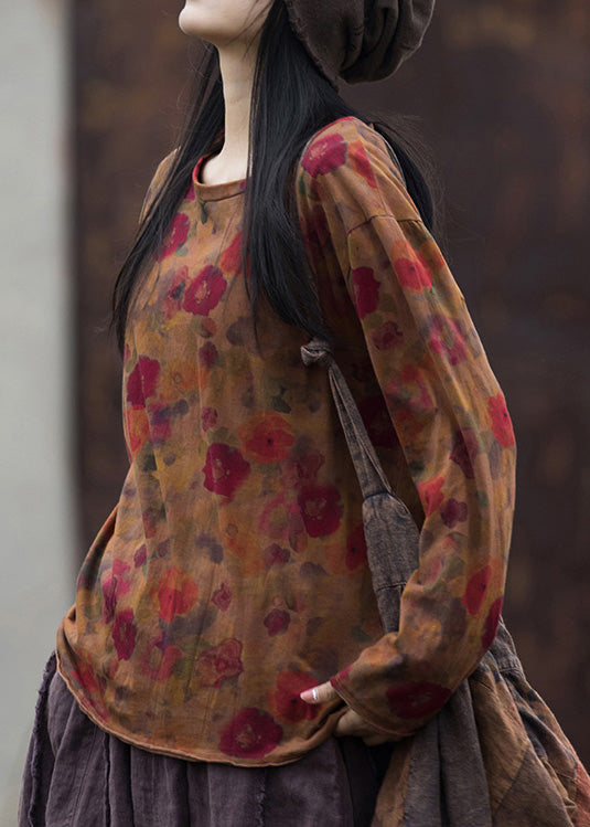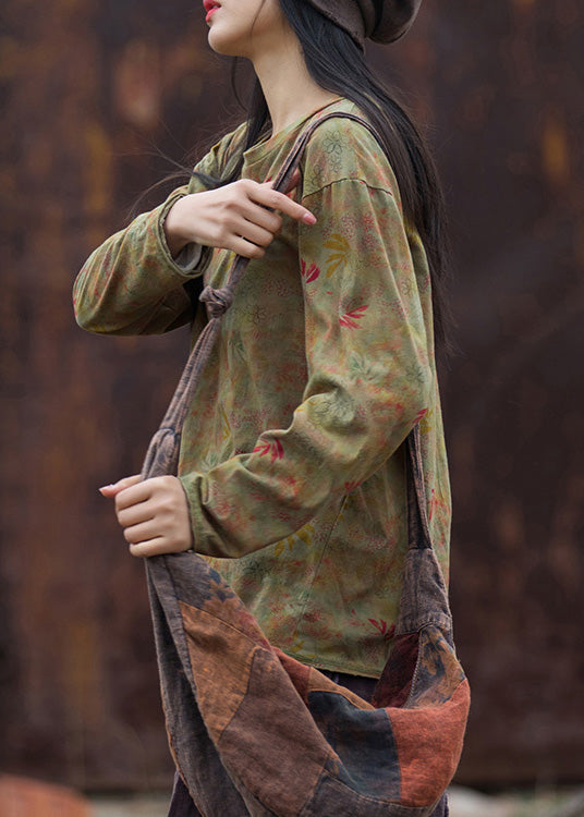 Natural Green O Neck Print Cotton T Shirt Top Long Sleeve LK011