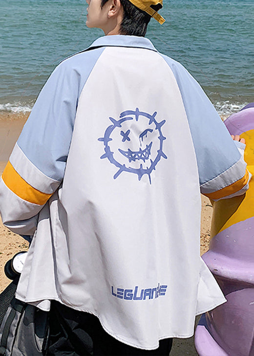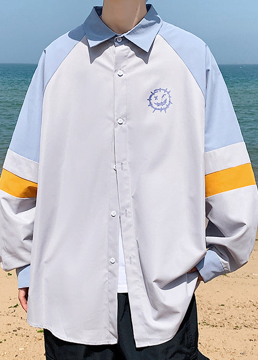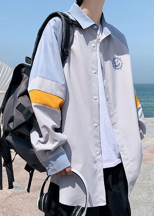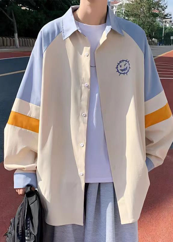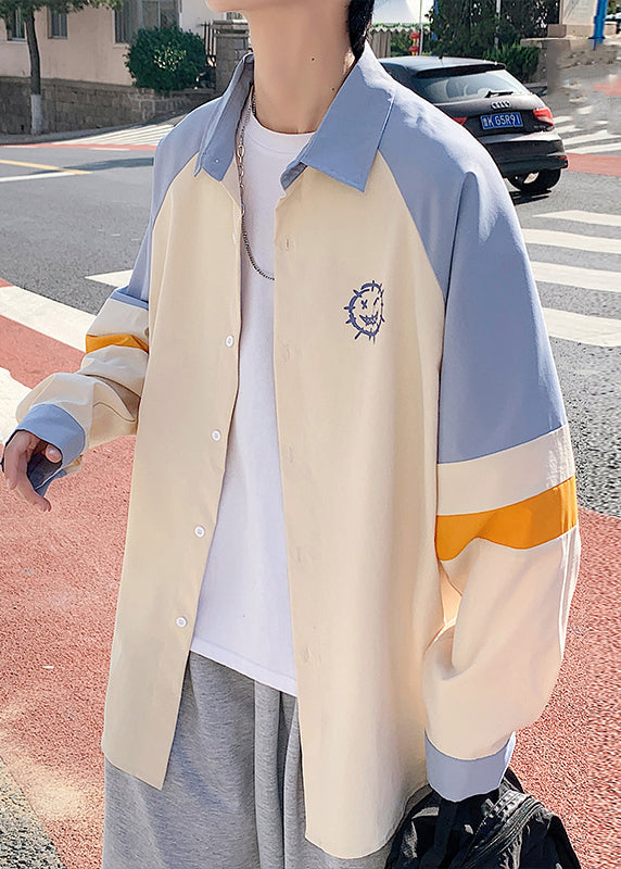 New Beige Peter Pan Collar Patchwork Cotton Shirt Men Fall RO010