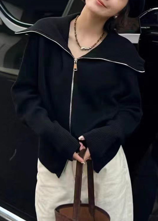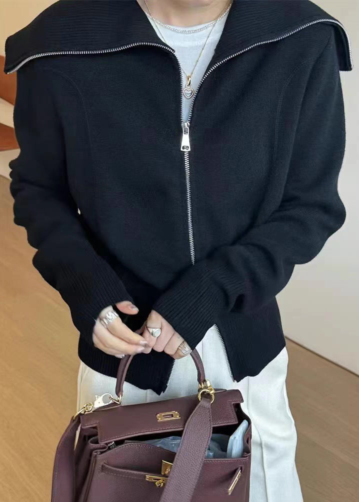 New Black Peter Pan Collar Zip Up Knit Sweater Fall RY021