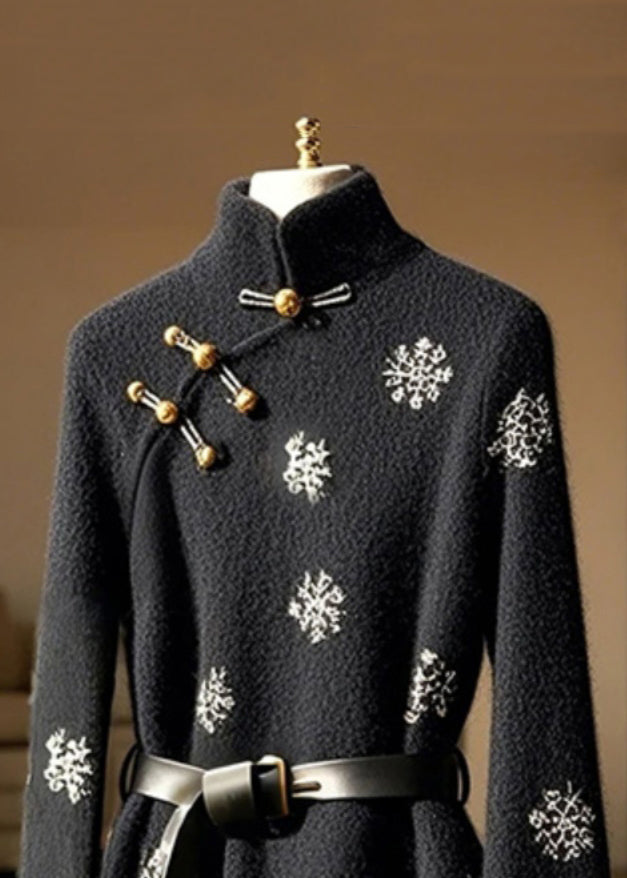 New Black Stand Collar Print Button Cotton Top Flare Sleeve TY006