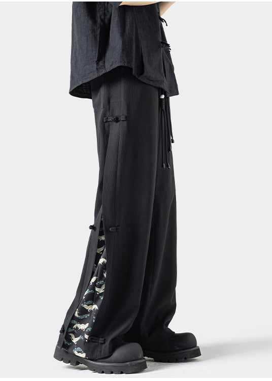 Introducing our New Dark Grey Chinese Button Ice Silk Men's Straight Leg Pants, perfect for the summer season. Made with premium quality ice silk material, these pants offer both style and comfort. Expertly crafted with a straight leg design, they are a must-have for any fashion-forward man.