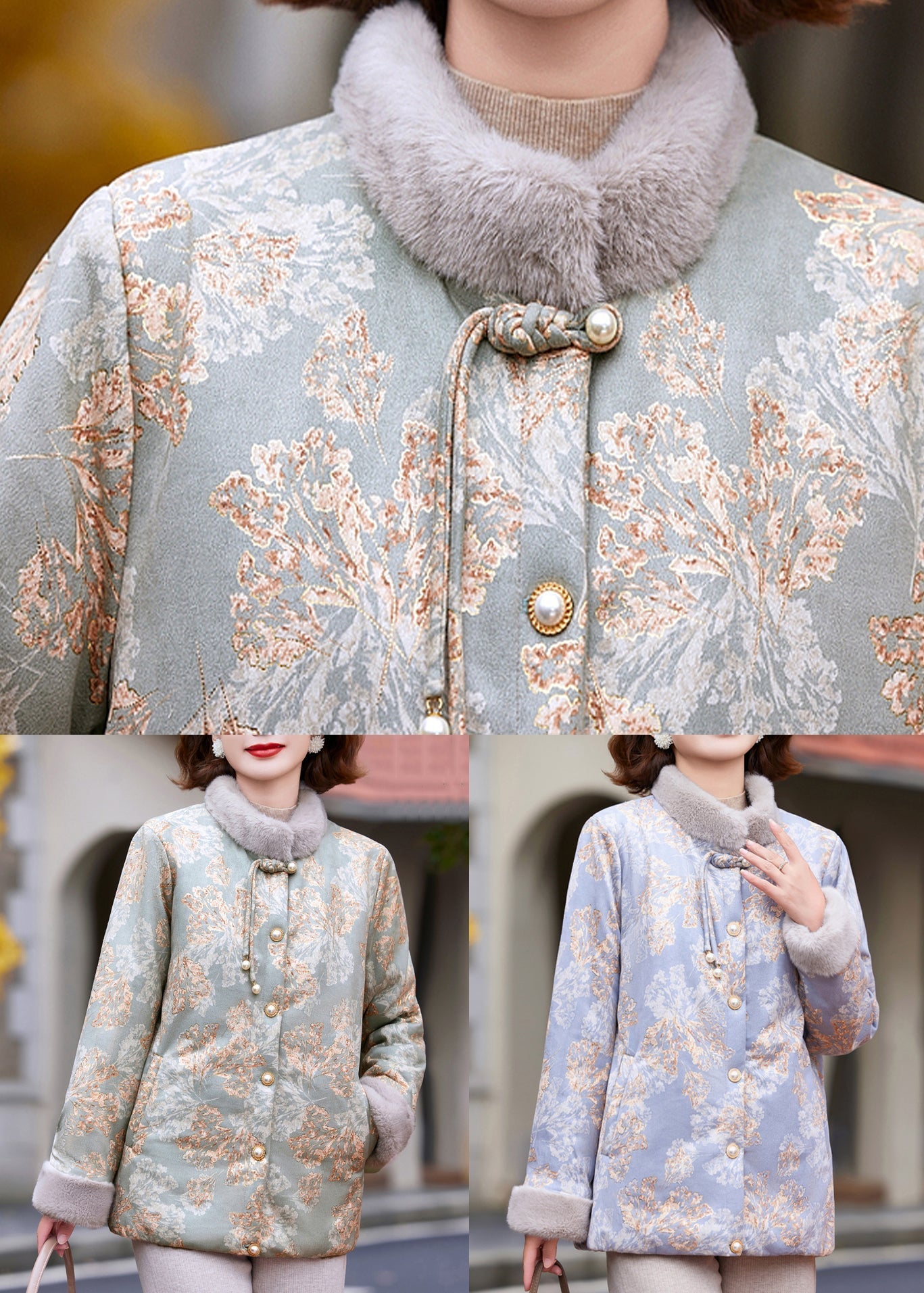 New Green Stand Collar Print Patchwork Warm Fleece Parka Winter RC018