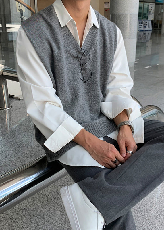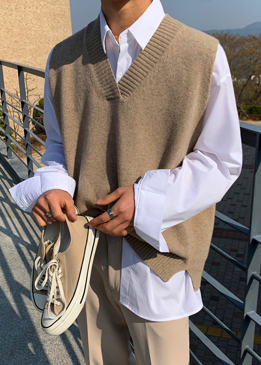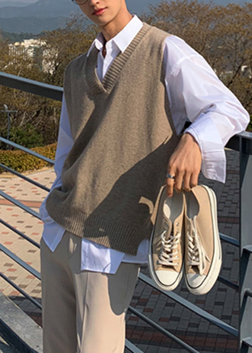 New Khaki V Neck Solid Cozy Knit Men Waistcoat Sleeveless RJ024