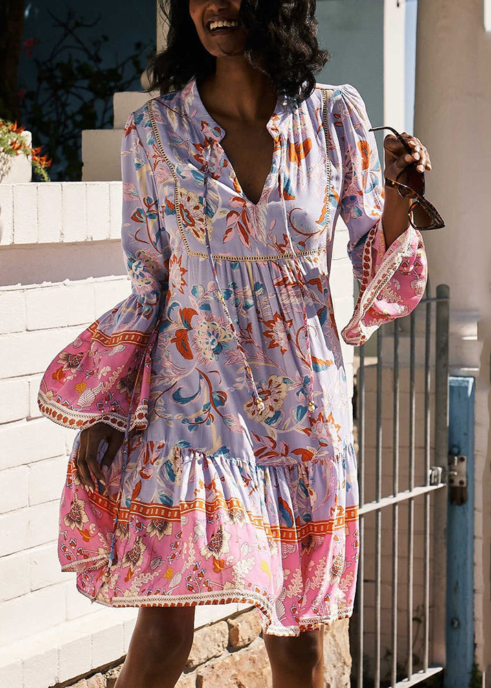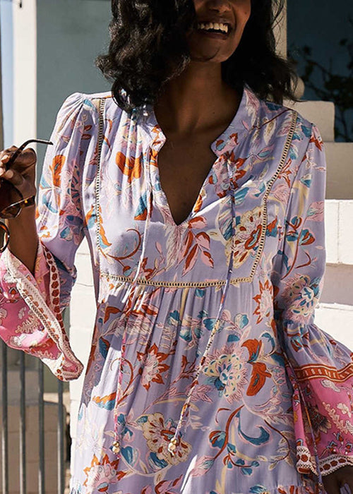 New Purple V Neck Lace Up Print Cotton Mid Dress Spring FF097