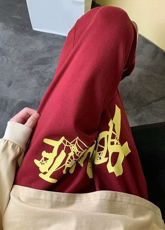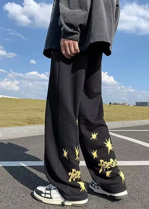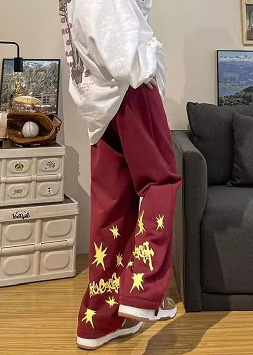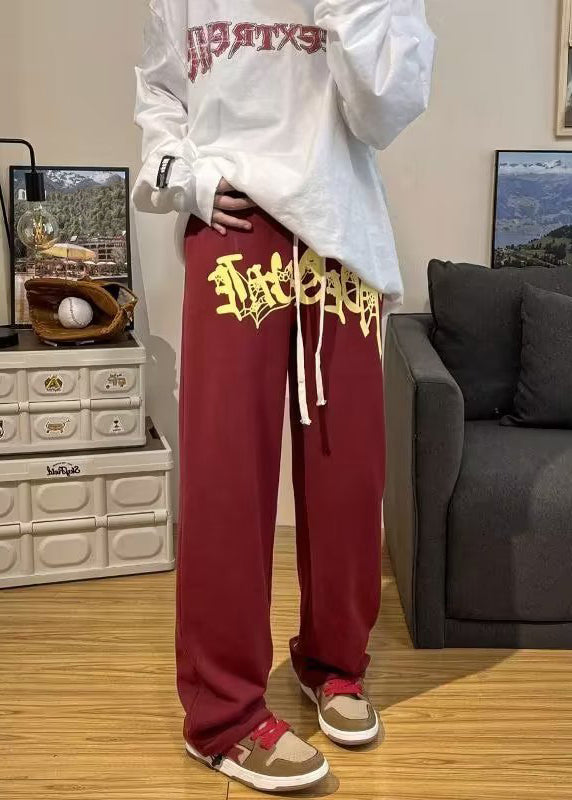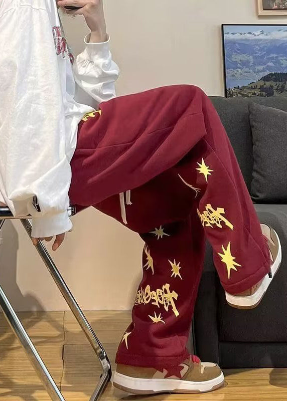 New Red Print Pockets Elastic Waist Cotton Mens Pants Fall WA044