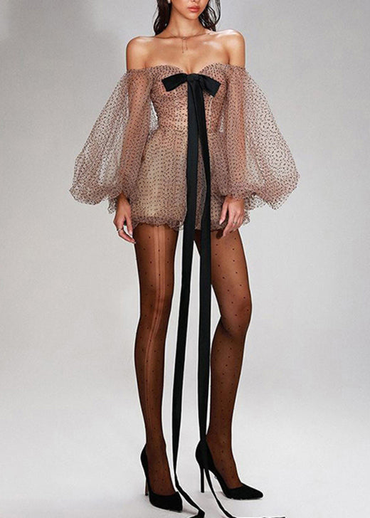 New Khaki Dot Cold Shoulder Tulle Mini Dresses Lantern Sleeve