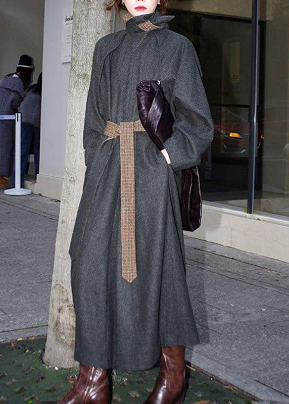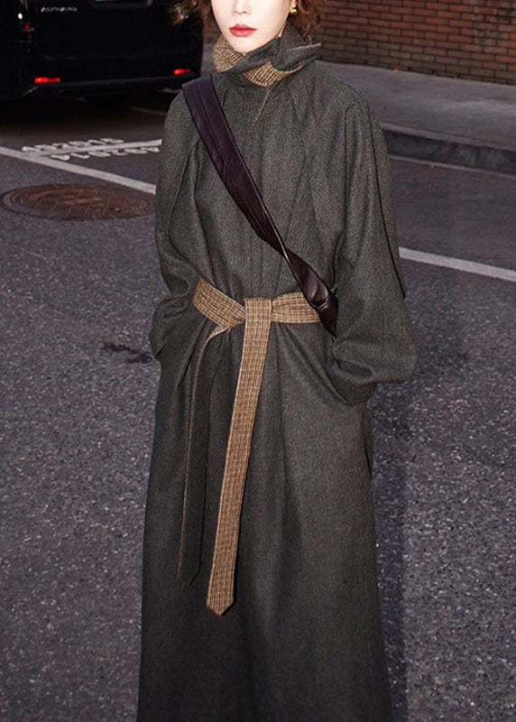 Novelty Blackish Green Turtleneck Patchwork Tie Waist Woolen Maxi Trench Coats Spring TA014