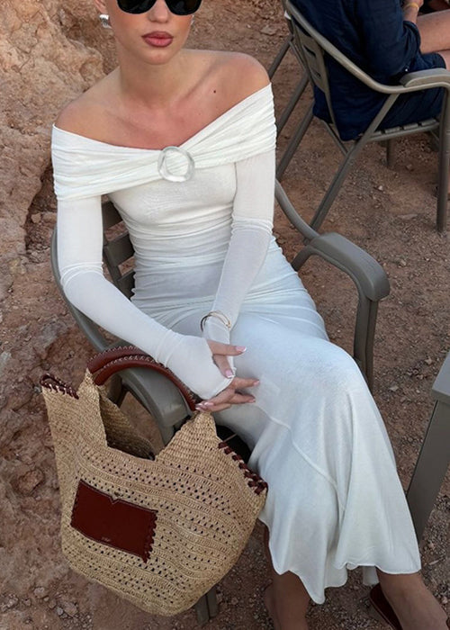 Slim Fit White Slash Neck Side Open Cotton Long Dresses Spring