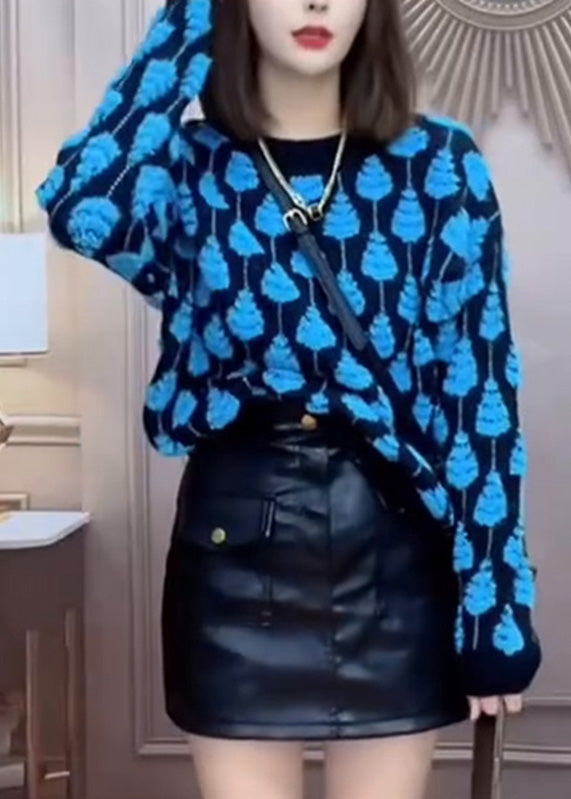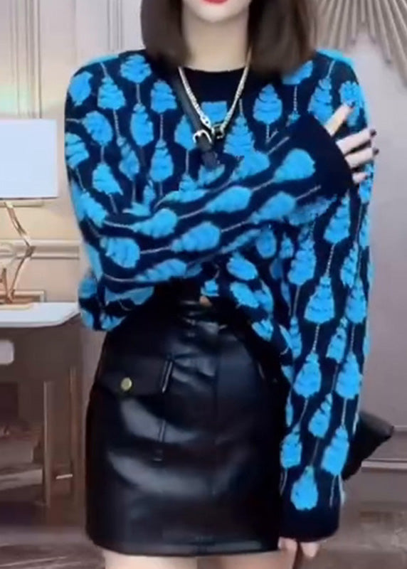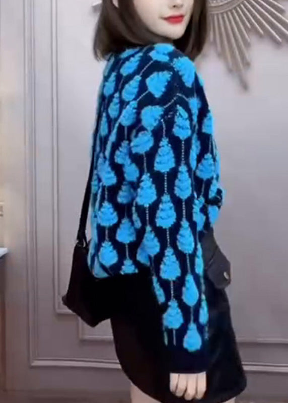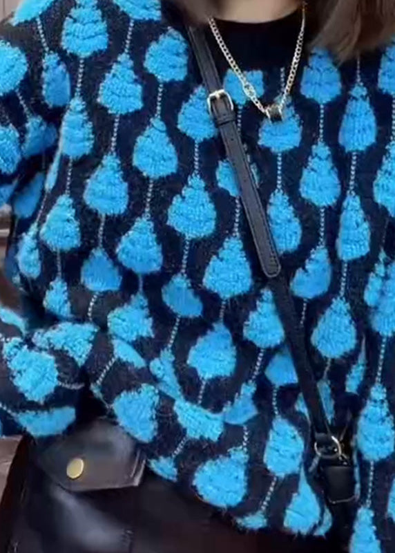 Organic Blue O-Neck Patchwork Thick Cotton Knit Sweater Winter RK010