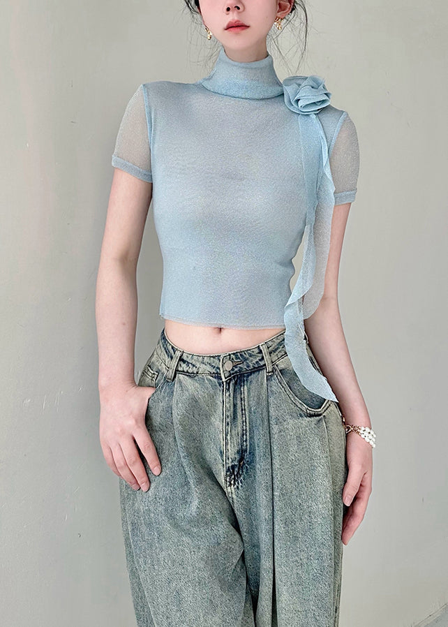 Original Blue Decorated Rose High Neck Slim Fit T Shirt Summer AL1064