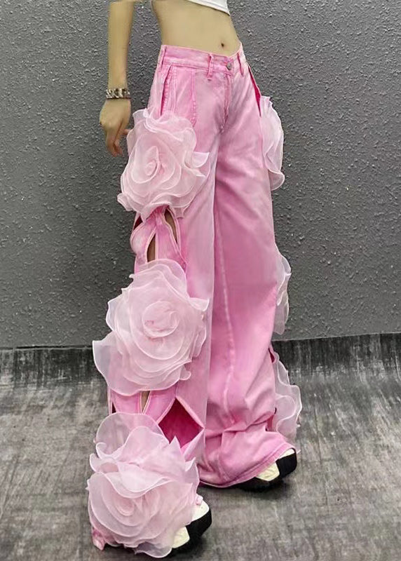 Original Design Blue Hollow Out Floral Denim Wide Leg Pants Fall RI035