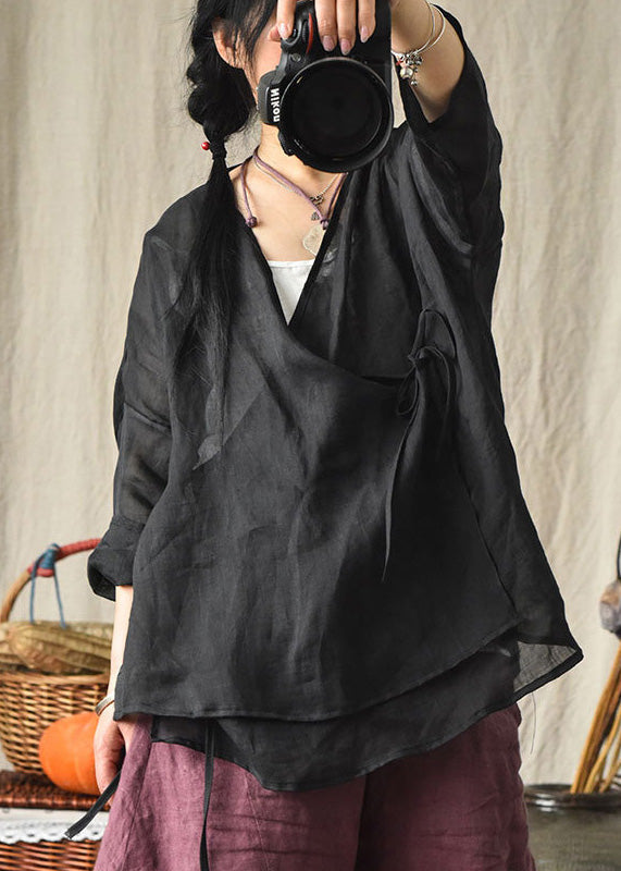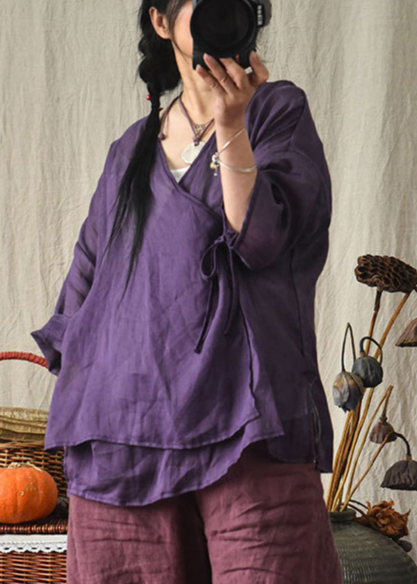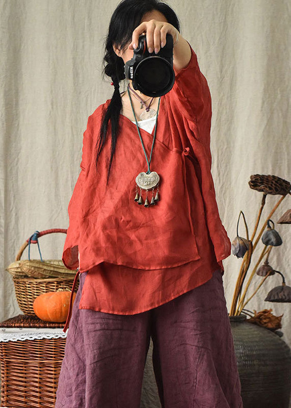 Original Design Red V Neck Lace Up Linen Blouses Summer LK029