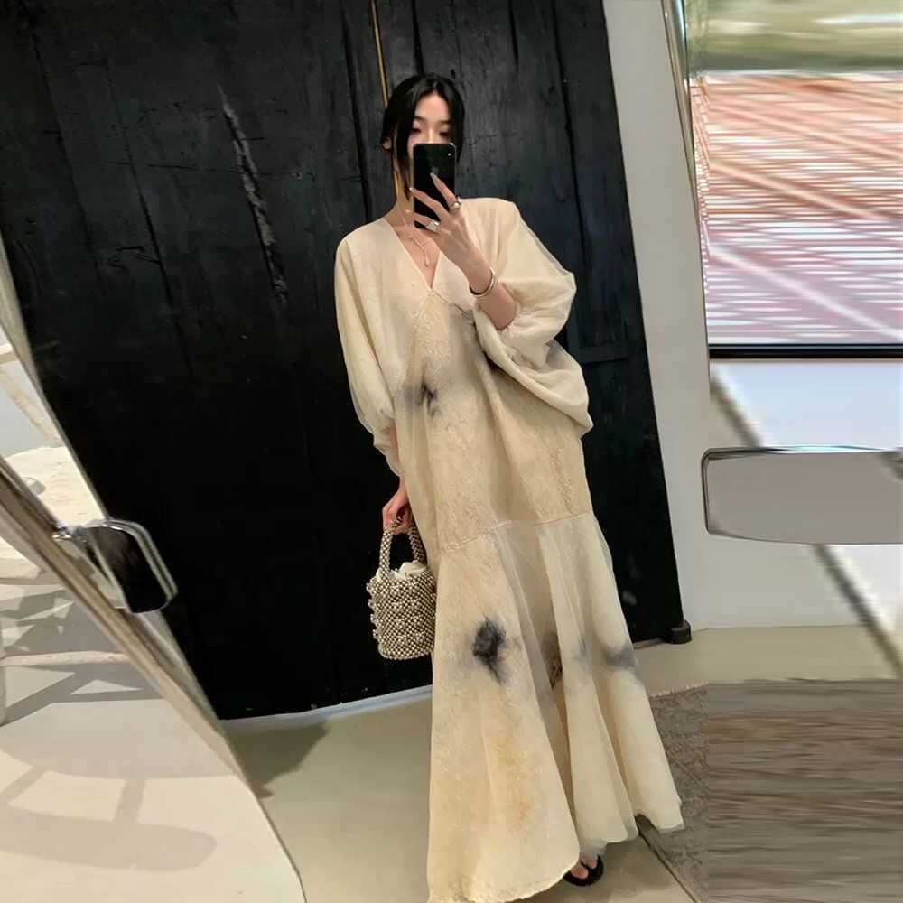 Original Design V Neck Print Patchwork Cotton Dresses Lantern Sleeve WW1001
