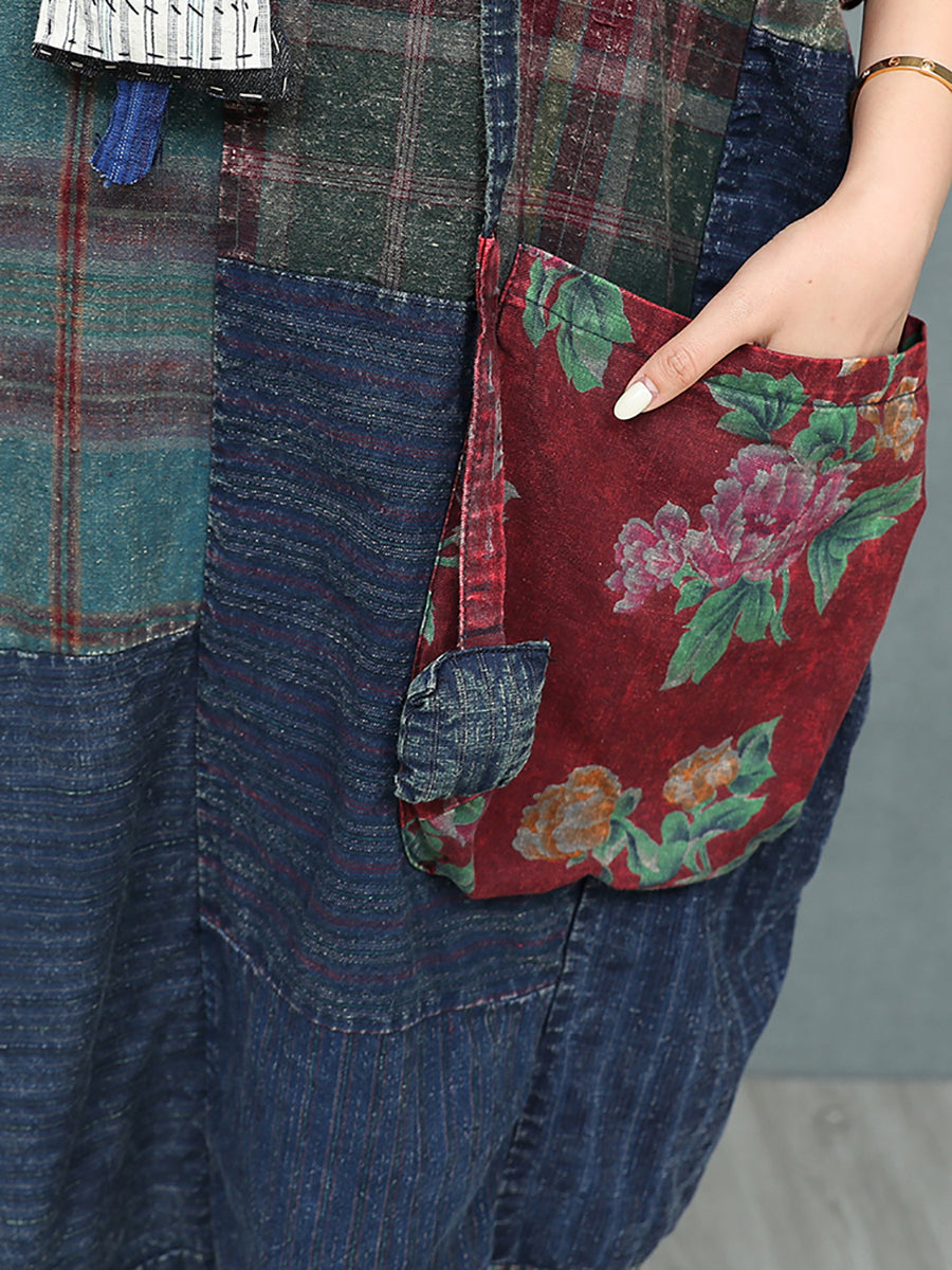 Patchwork Cotton Women Summer Retro O-Neck Dress