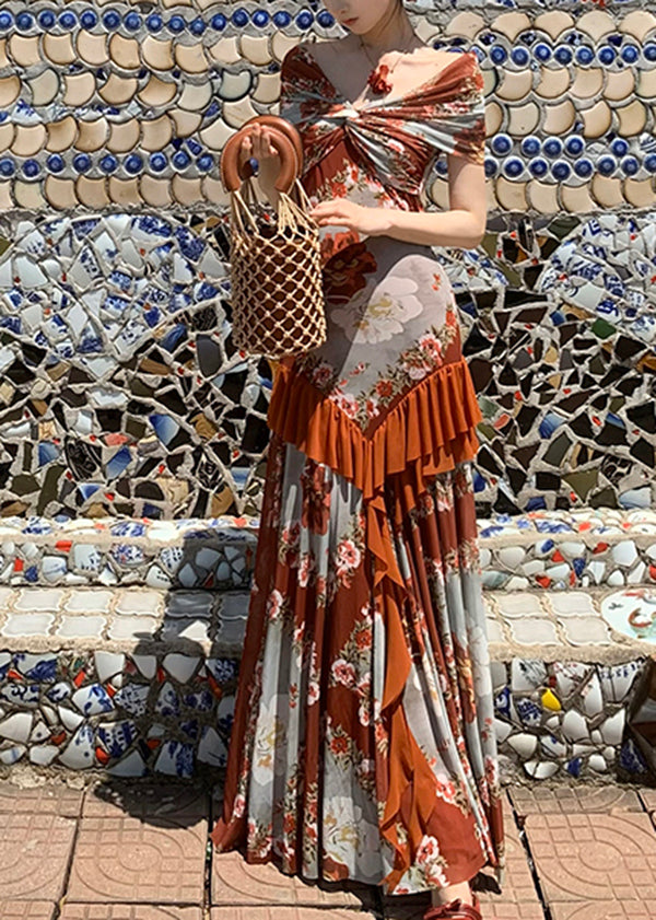 French Ruffled Print Patchwork Cotton Long Dress Summer