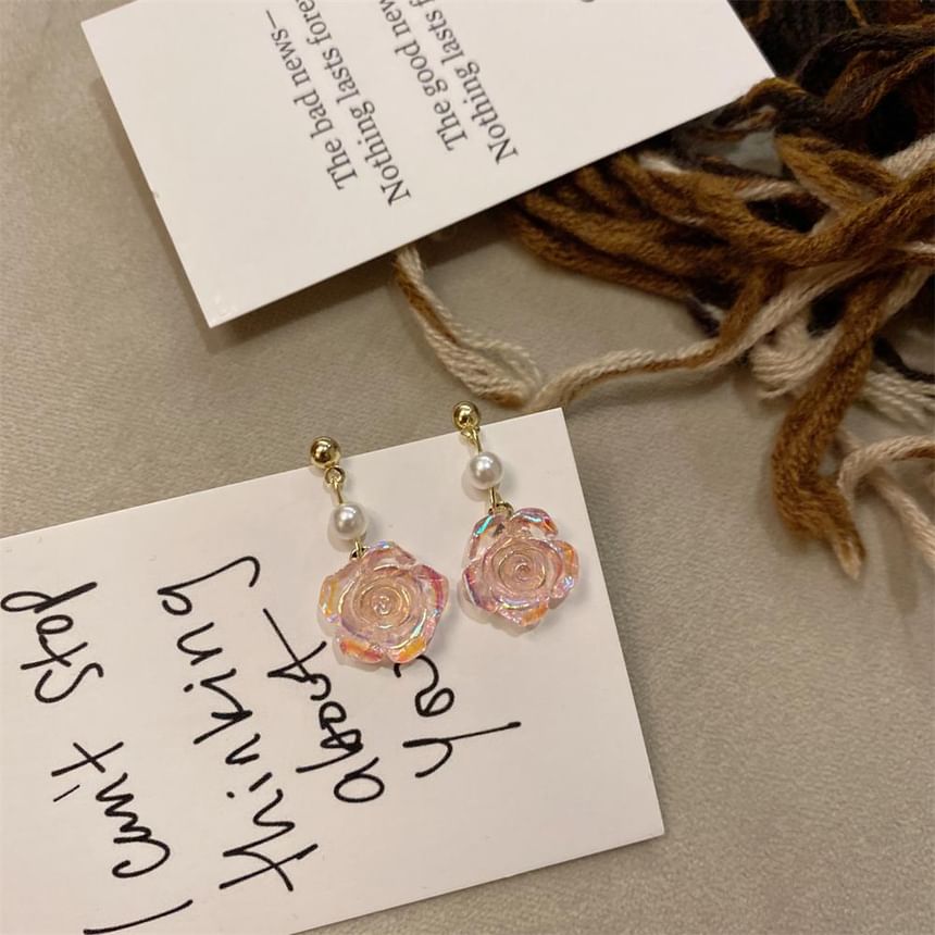 Cute Pink Crystal Pearl Tulle Floral Tassel Drop Earrings LL007