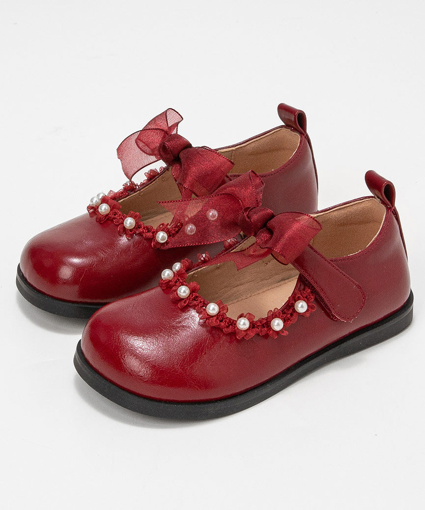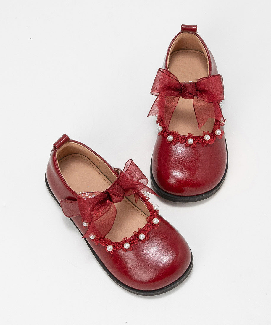 Beautiful Beige Pearl Tulle Bow For Girls Buckle Strap Platform Flat Shoes
