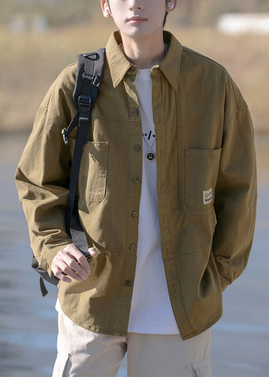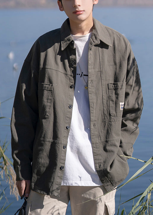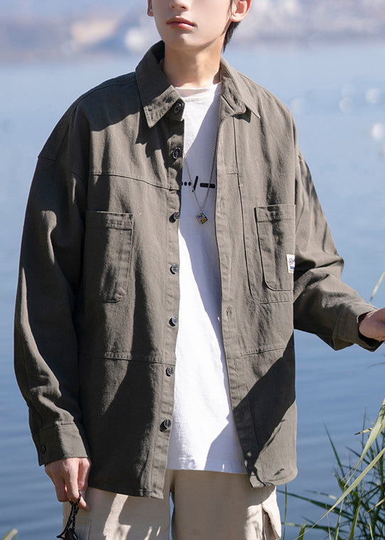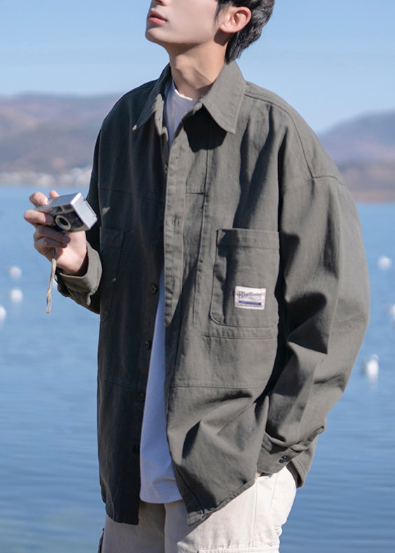 New Dark Gray Peter Pan Collar Button Pockets Cotton Mens Shirts Coats Spring
