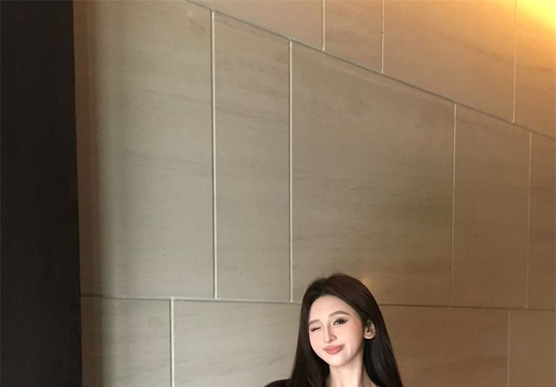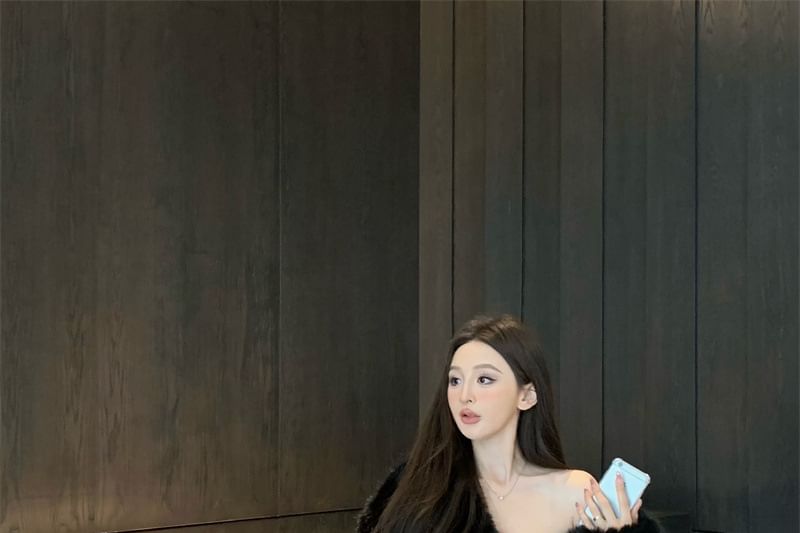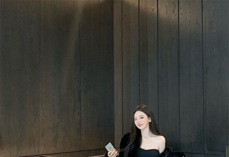 Plain Crop Tube Top / High Waist Mini A-Line Skort / Fluffy Open Front Jacket