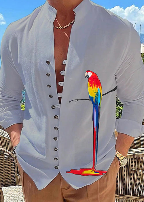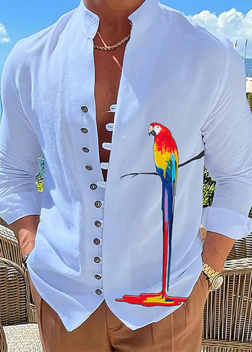 Plus Size Green Stand Collar Print Button Cotton Men Shirts Fall