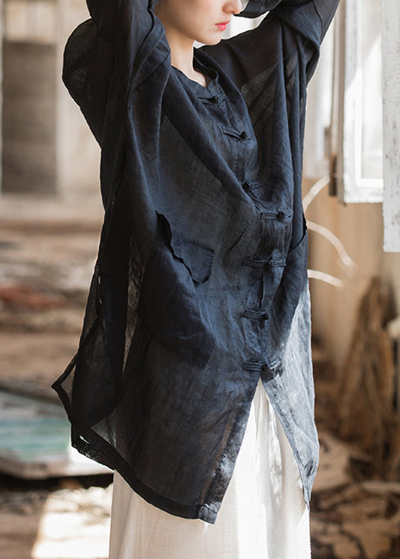 Plus Size Black Oriental Button Linen Shirts Tops Spring TZ049