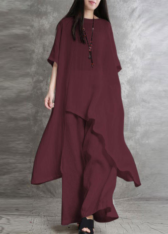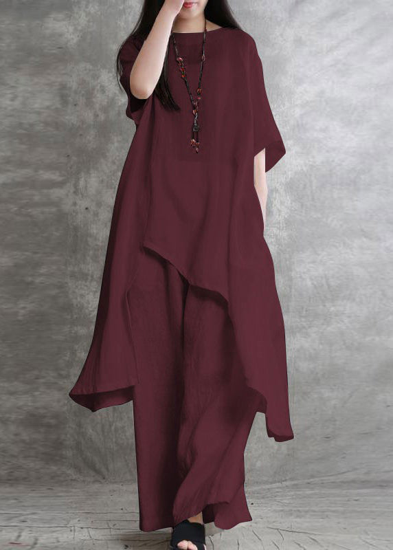 This set includes a white, asymmetrical top and wide leg pants, both designed for plus size individuals. The top features a short sleeve, while the pants are cut in a wide leg style.