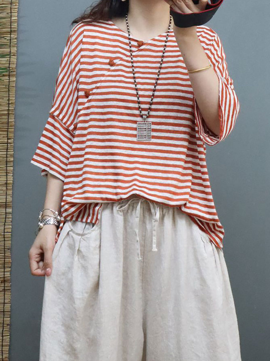 Plus Size Women Summer Vintage Stripe Linen Shirt SC1027