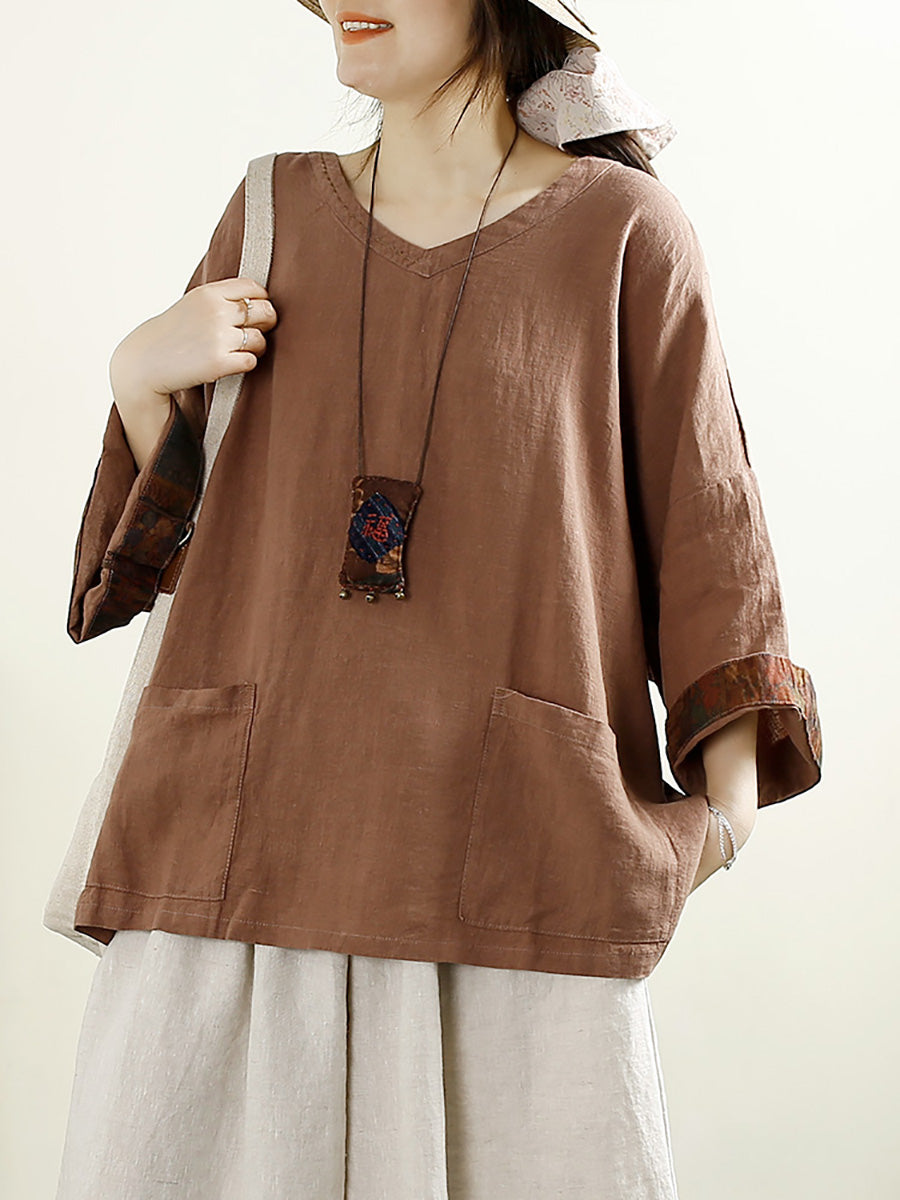 Plus Size Women Vintage Solid V-Neck 100%Linen Blouse AK1006
