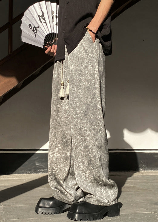 Grey Pockets Silk Mens Wide Leg Pants Elastic Waist