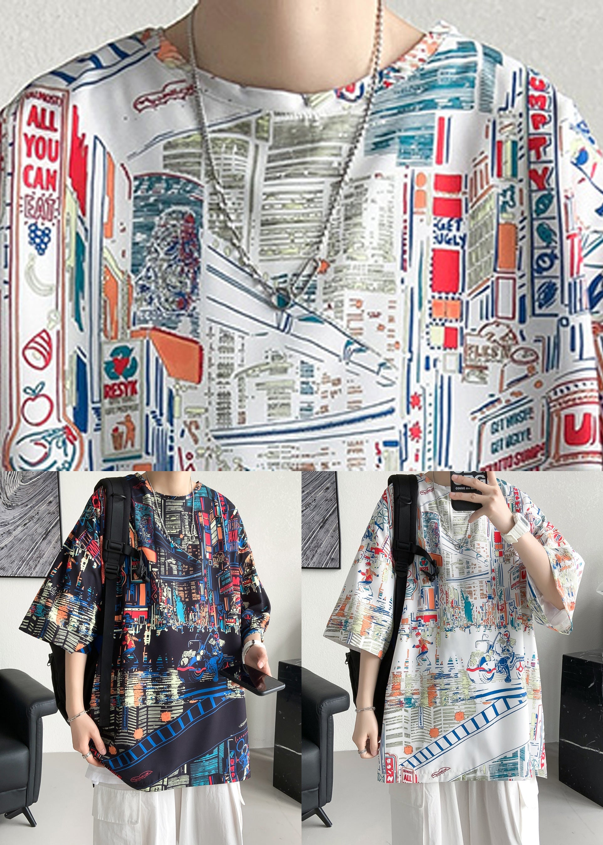 Print Cotton Summer Mens O Open Neck T Black Side Shirts