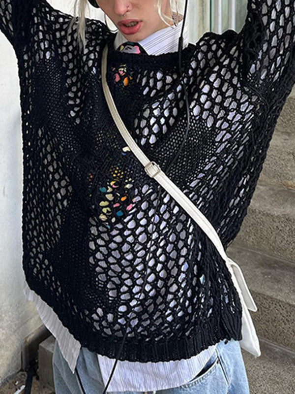 Punk White Round-Neck Hollow Out Cross Knit Long Sleeve Top AN1063