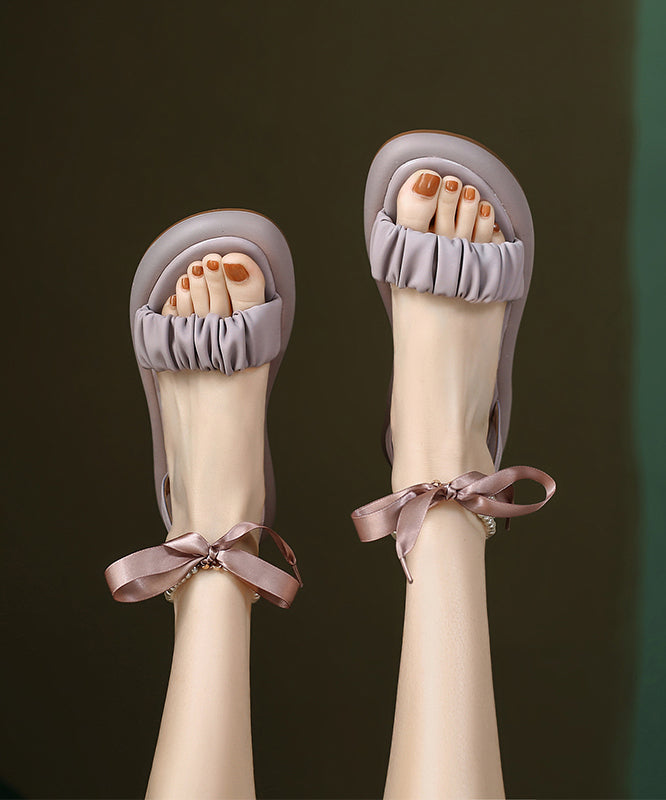 The Purple Cowhide Leather Sandals feature a peep toe design with a splicing bow and lace up closure.
