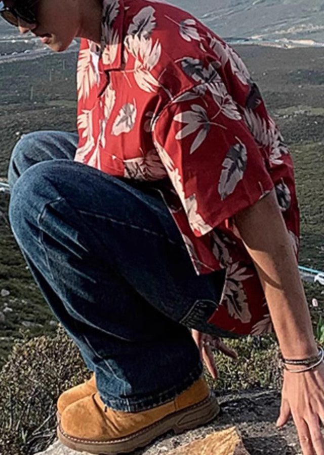 Red Peter Collar Print Summer Pan Men Shirt Cotton Button Loose