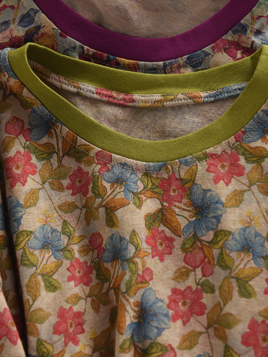 Retro O-Neck 100%Cotton Women Flower Summer Shirt