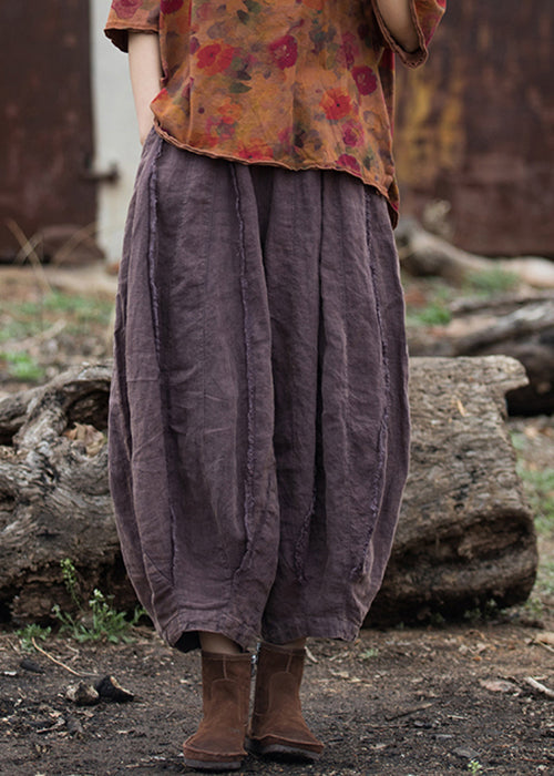 Retro Purple Pockets Elastic Waist Linen Crop Pants Summer QE026