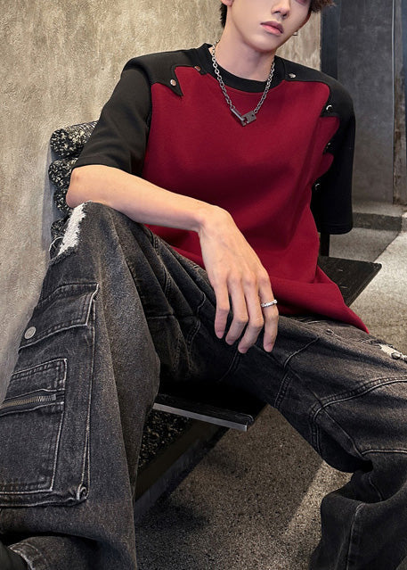 Bohemian Red Patchwork Rivet Cotton Mens Graphic Tees Summer