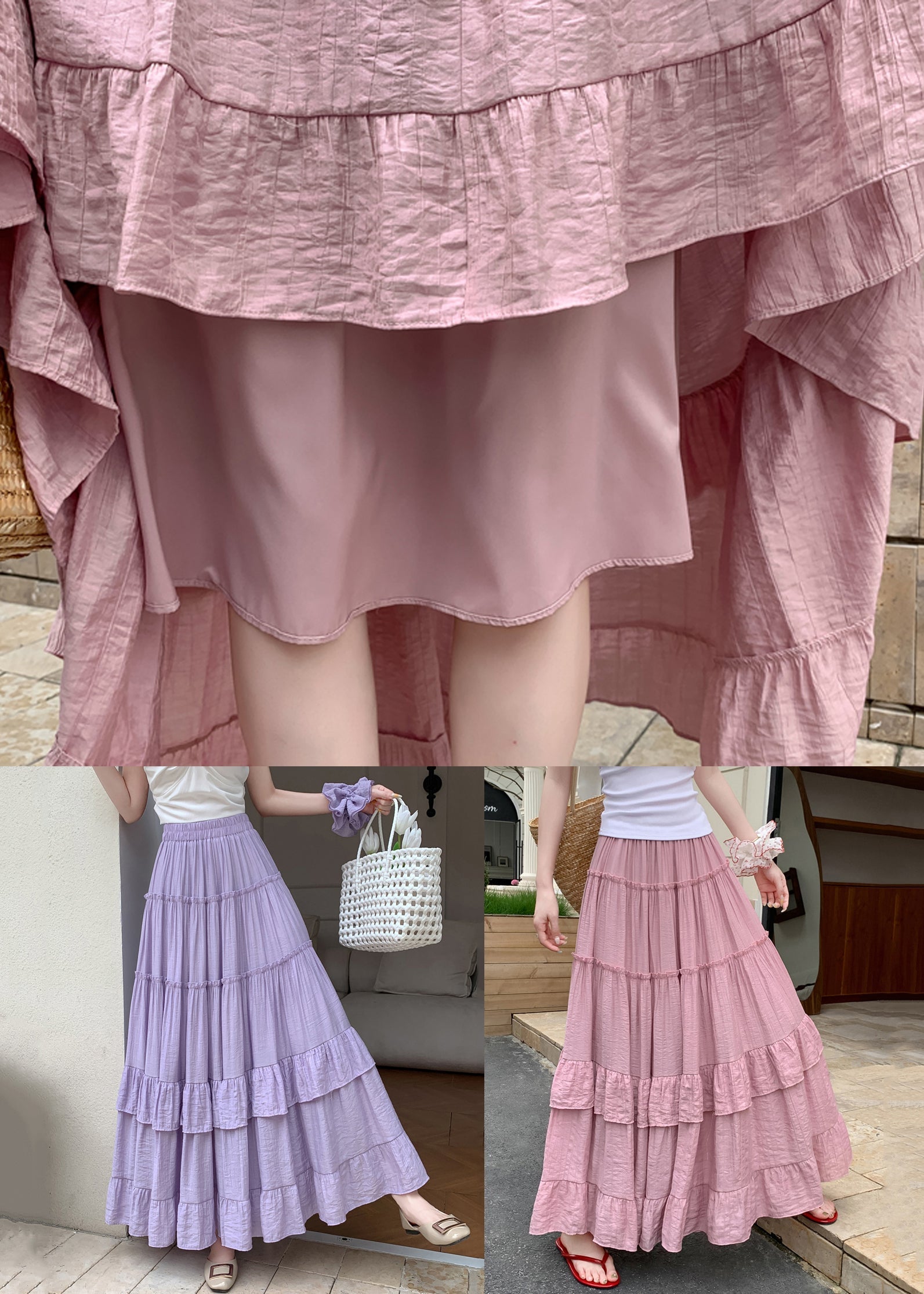 Ruffled Skirts Art Waist Elastic Summer Pink Cotton