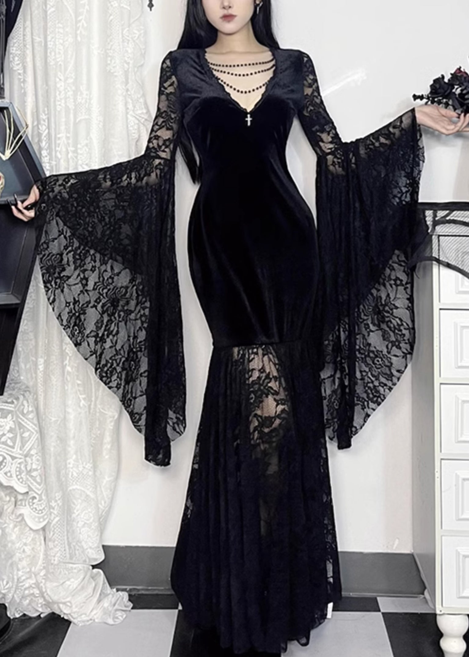 Sexy Black V Neck Lace Patchwork Silk Velvet Long Dresses Flare Sleeve YT029