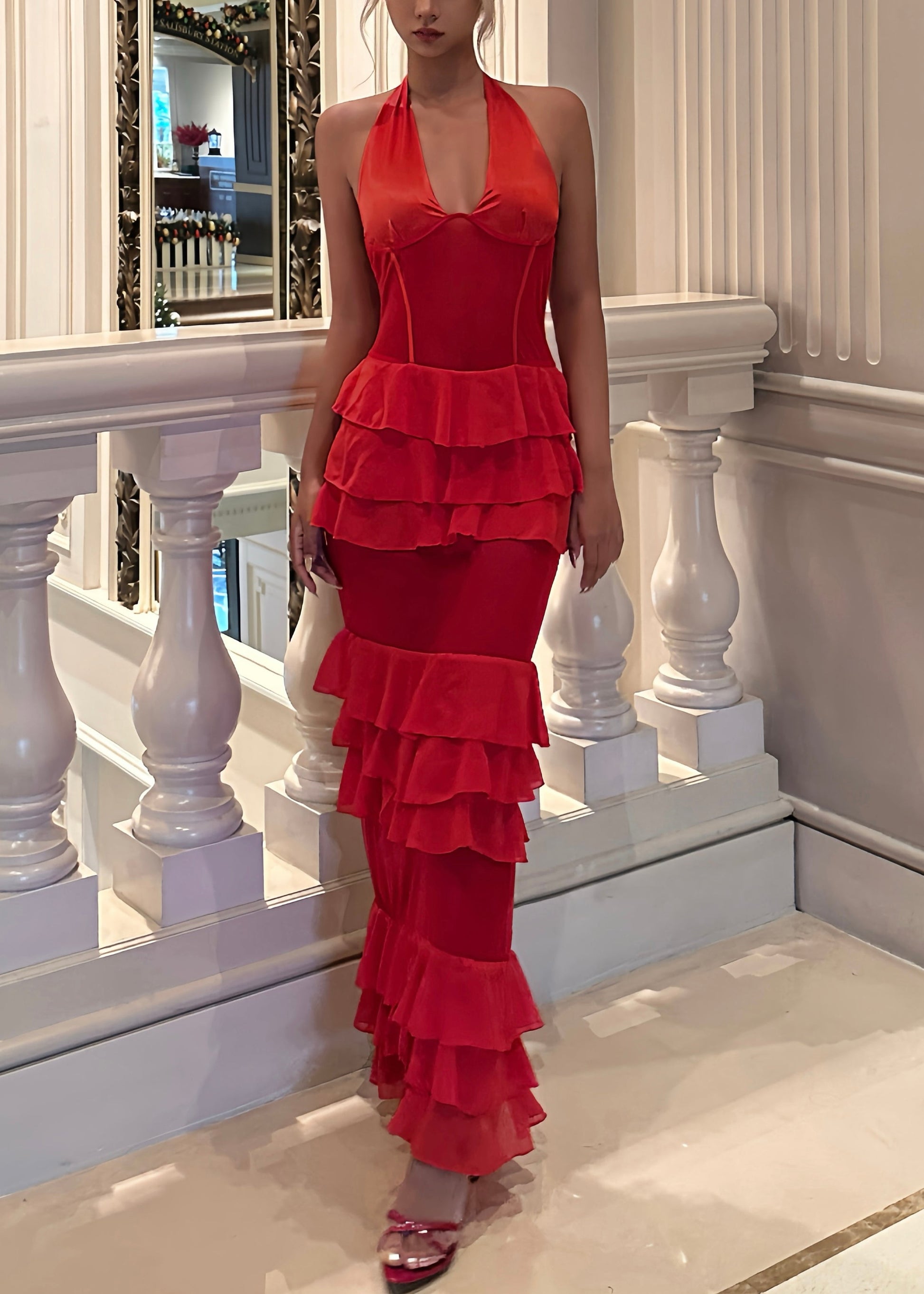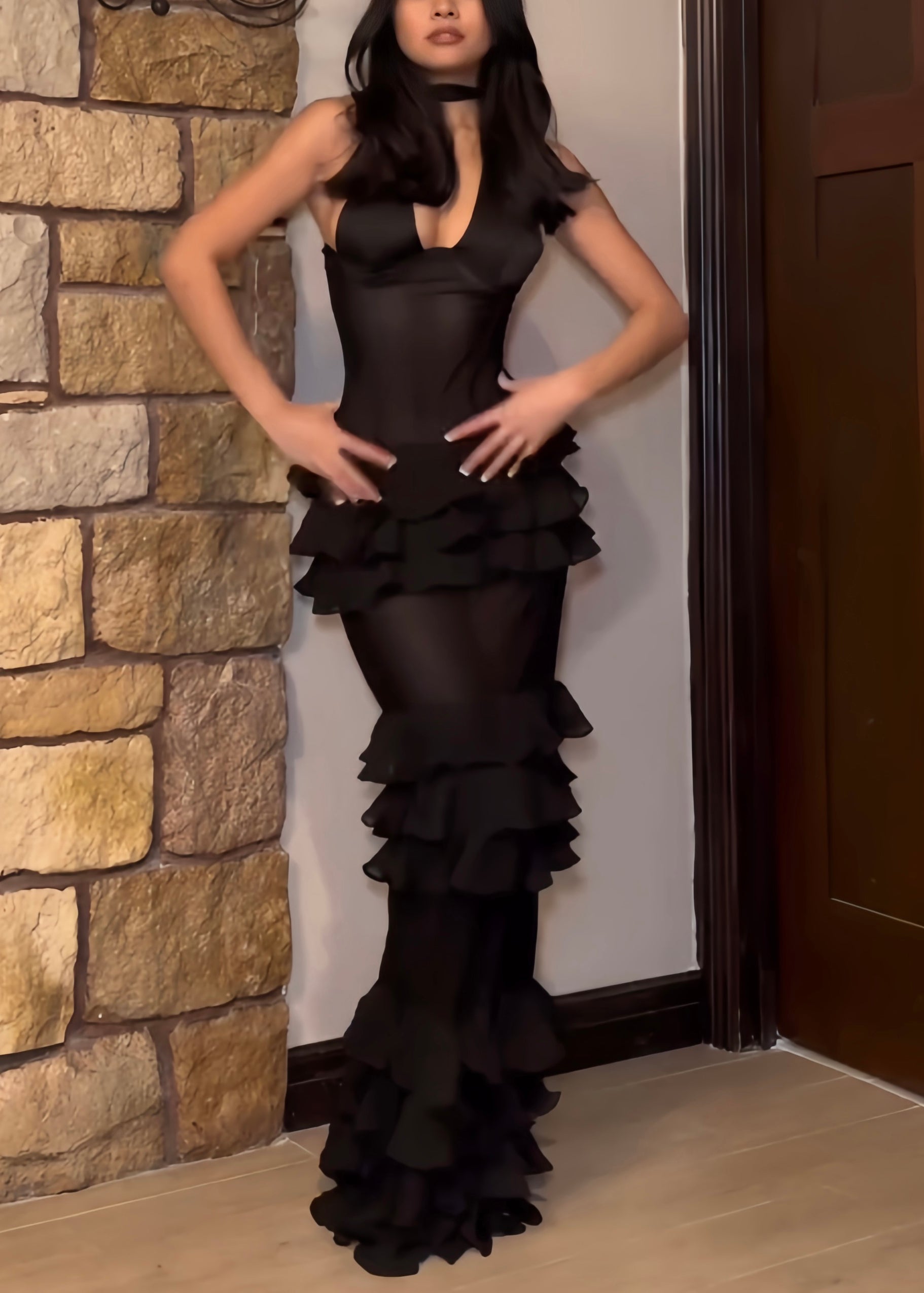 Indulge in the ravishing allure of our alluring Sexy Black V Neck Ruffled Tulle Maxi Dress. Featuring delicate ruffles, a plunging neckline, and a sleeveless design, this dress exudes luxury and sophistication. Step into the world of high fashion and grace any occasion with effortless elegance.