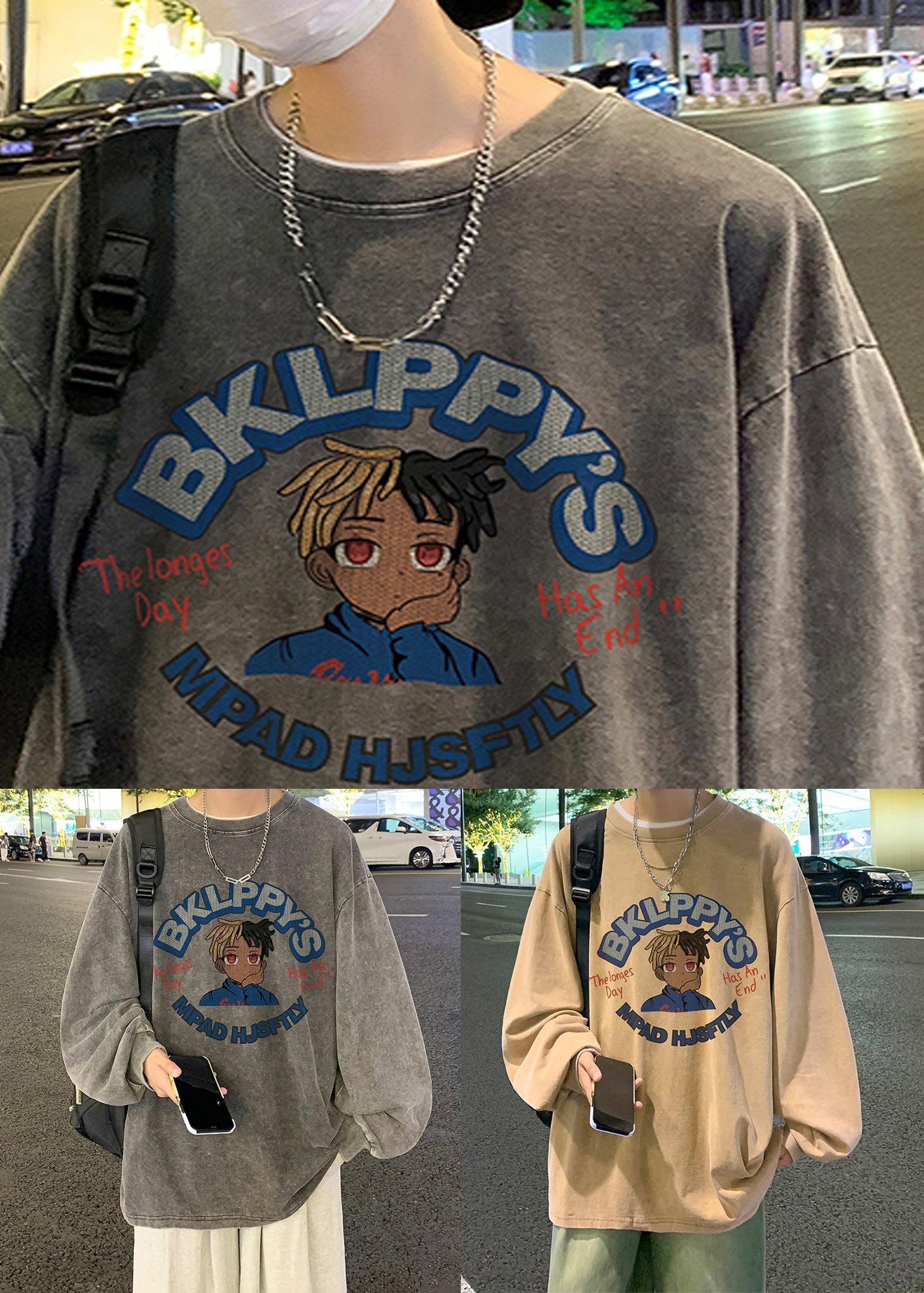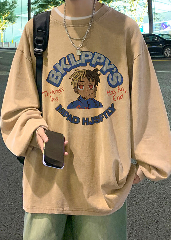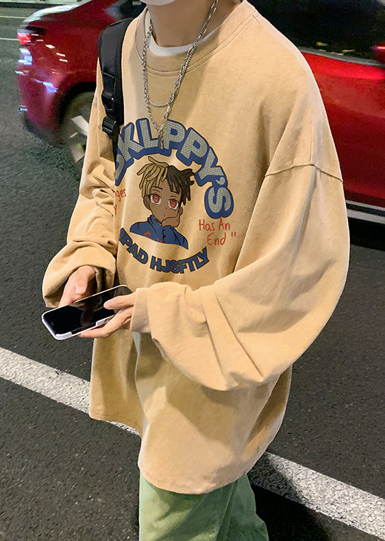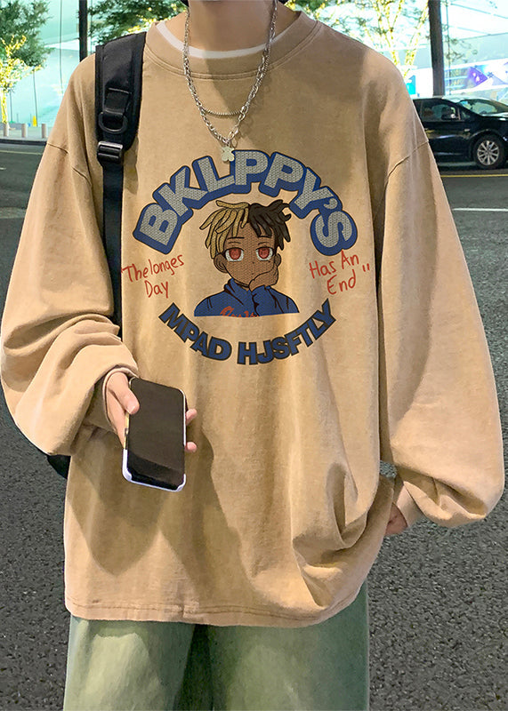 Khaki Print Loose Cotton Mens T Shirts O Neck Spring