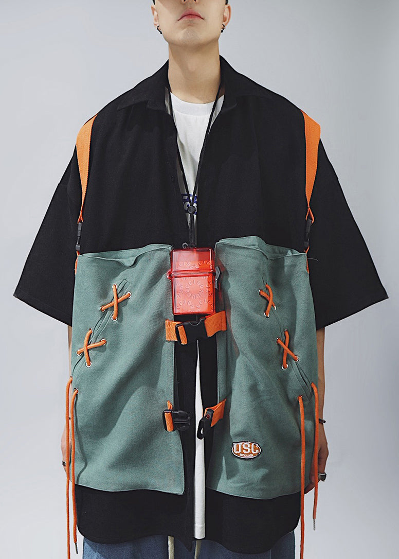Chic Khaki Lace Up Patchwork Cotton Men T Shirts Half Sleeve