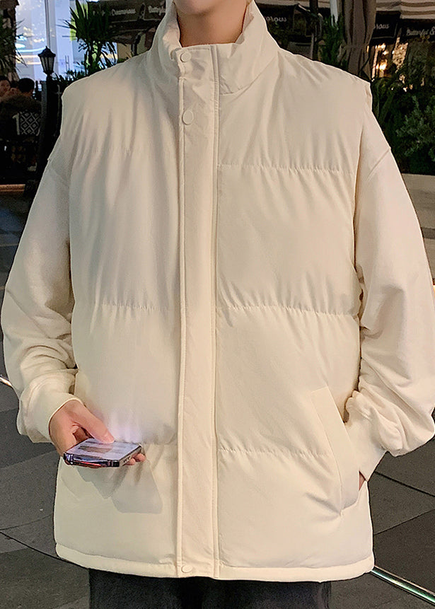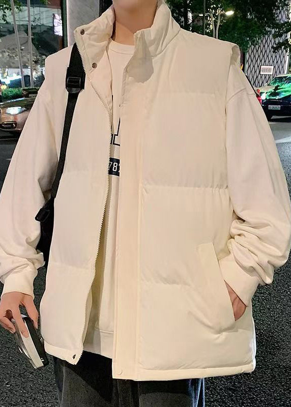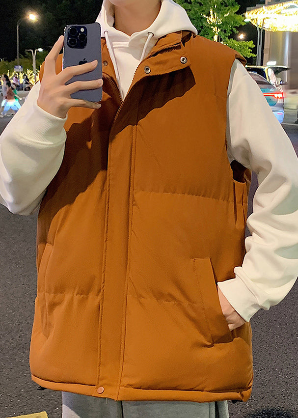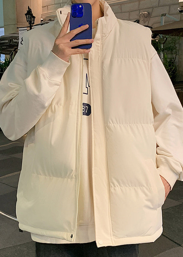 Simple Beige Stand Collar Pockets Cotton Filled Men Waistcoat Winter EQ028
