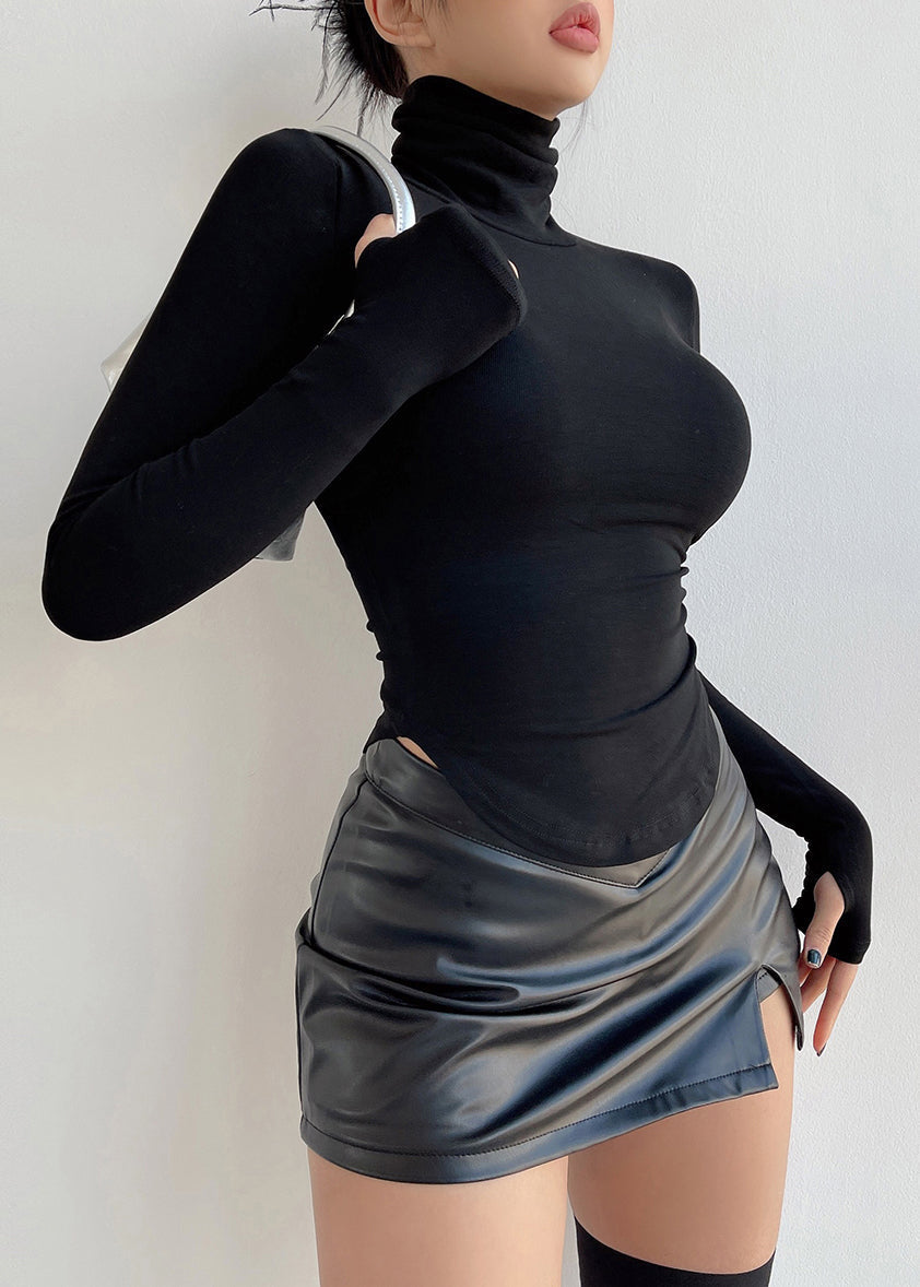 Simple Coffee Hign Neck Slim Fit Cotton T Shirts Fall AL1079