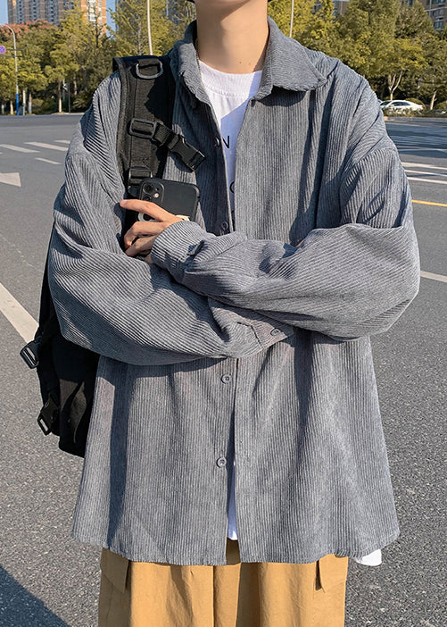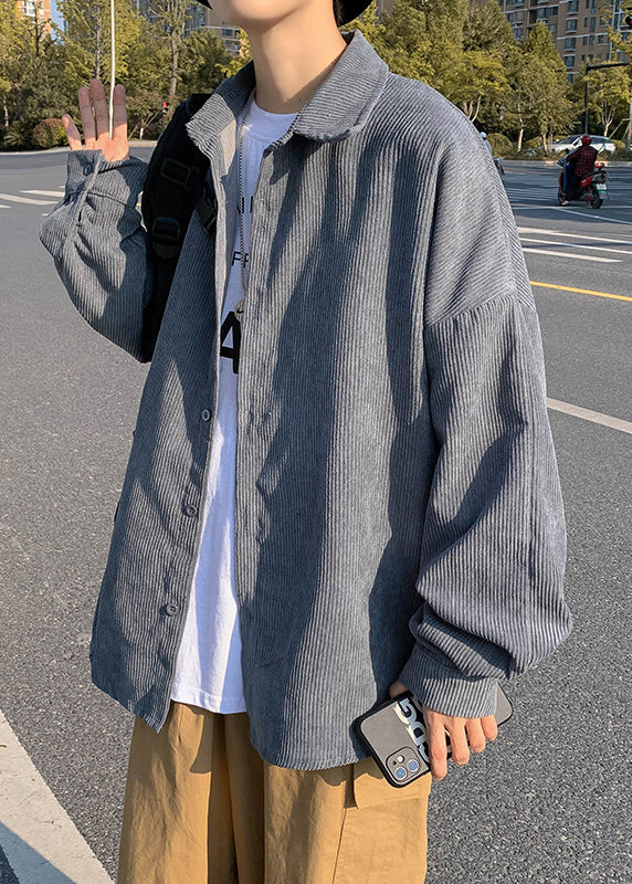 Simple Blue Peter Pan Collar Button Corduroy Mens Shirts Coat Spring