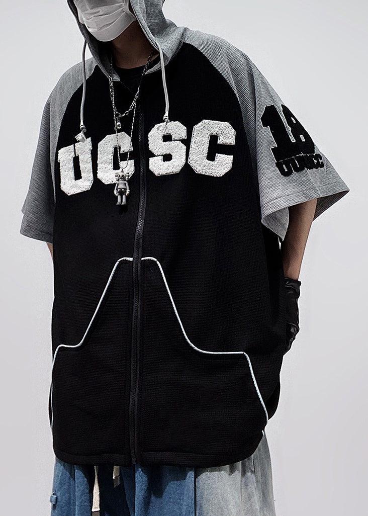 Plus Size Black Hooded Zippered Patchwork Cotton Men T Shirts Half Sleeve