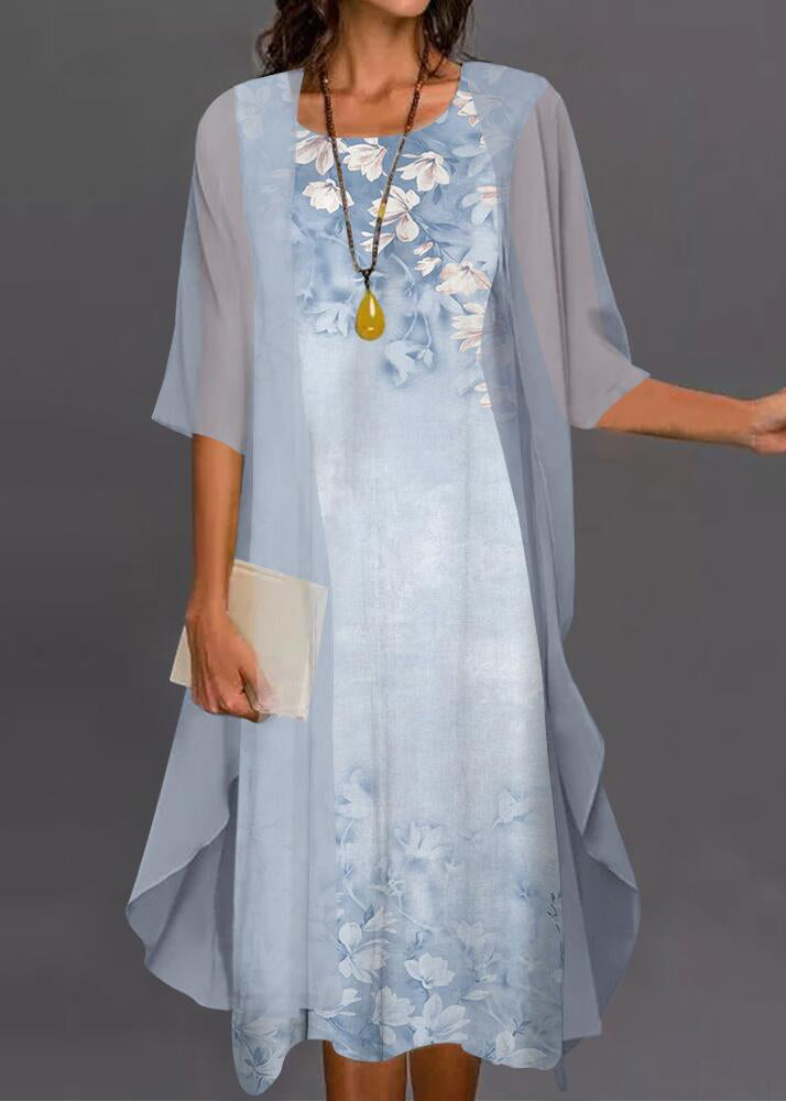 New Pink O-Neck Print Chiffon Two Pieces Set Half Sleeve
