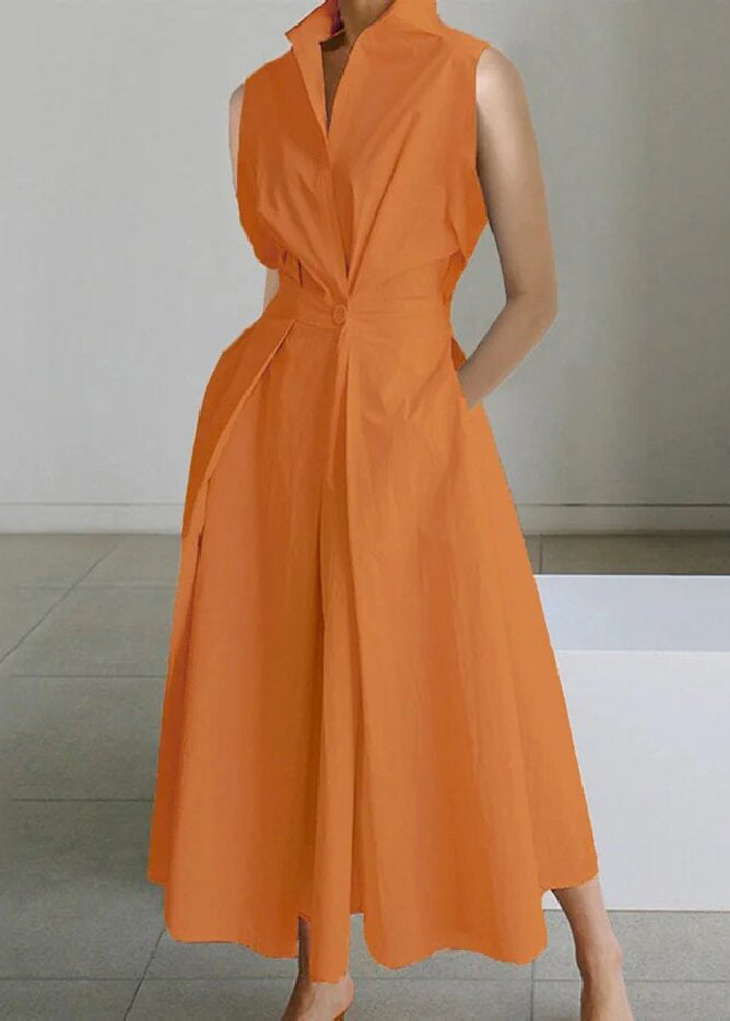 Loose White Button Pockets Solid Cotton Long Dress Sleeveless