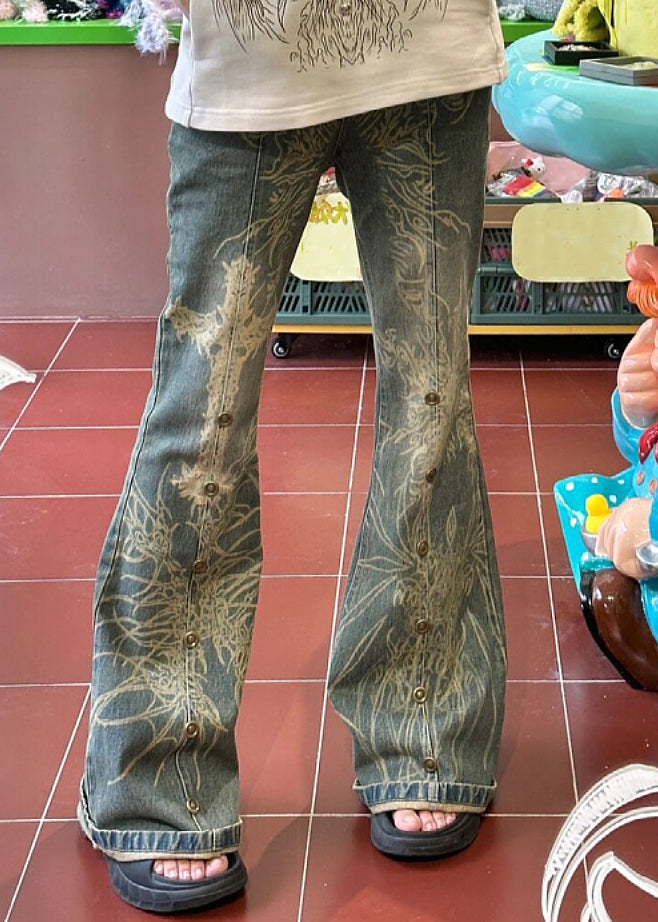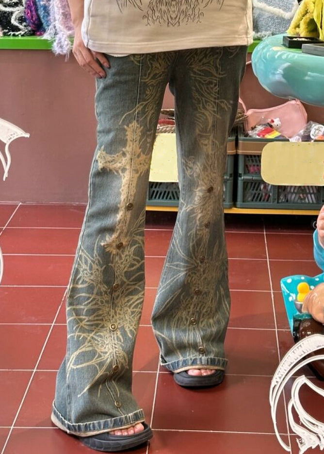 Slim Fit Blue Print Nail Bead Denim Flared Trousers Fall QF047