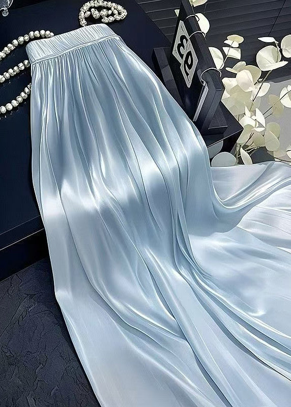 Simple Blue Wrinkled Elastic Waist Solid Silk Skirt Summer