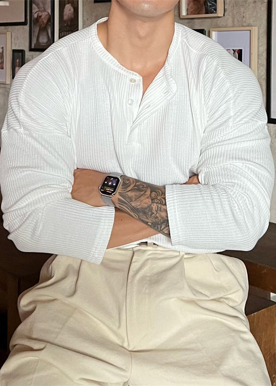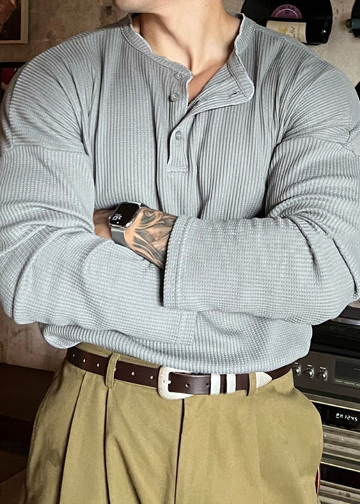 Solid Spring Men T Button Shirts Neck Grey Loose Cotton O
